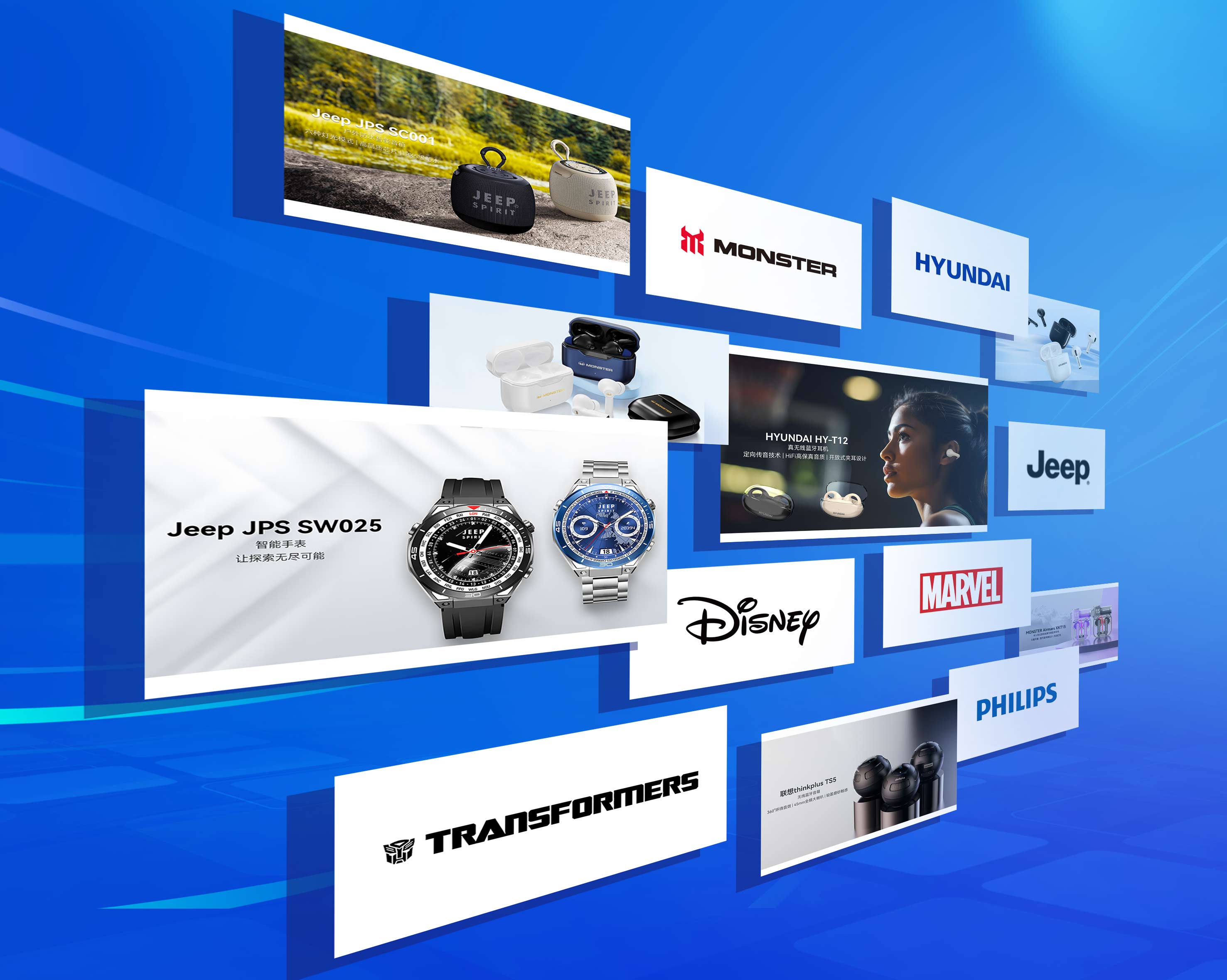 坚持与国际接轨的发展模式,始终与国际化品牌保持紧密合作。目前,已经与JEEP、MONSTER、HYUNDAI、联想thinkplus、PHILIPS、DISNEY、MARVEL、TRANSFORMERS等多个世界五百强企业、知名品牌及IP建立了良好的合作关系。
