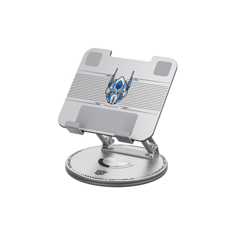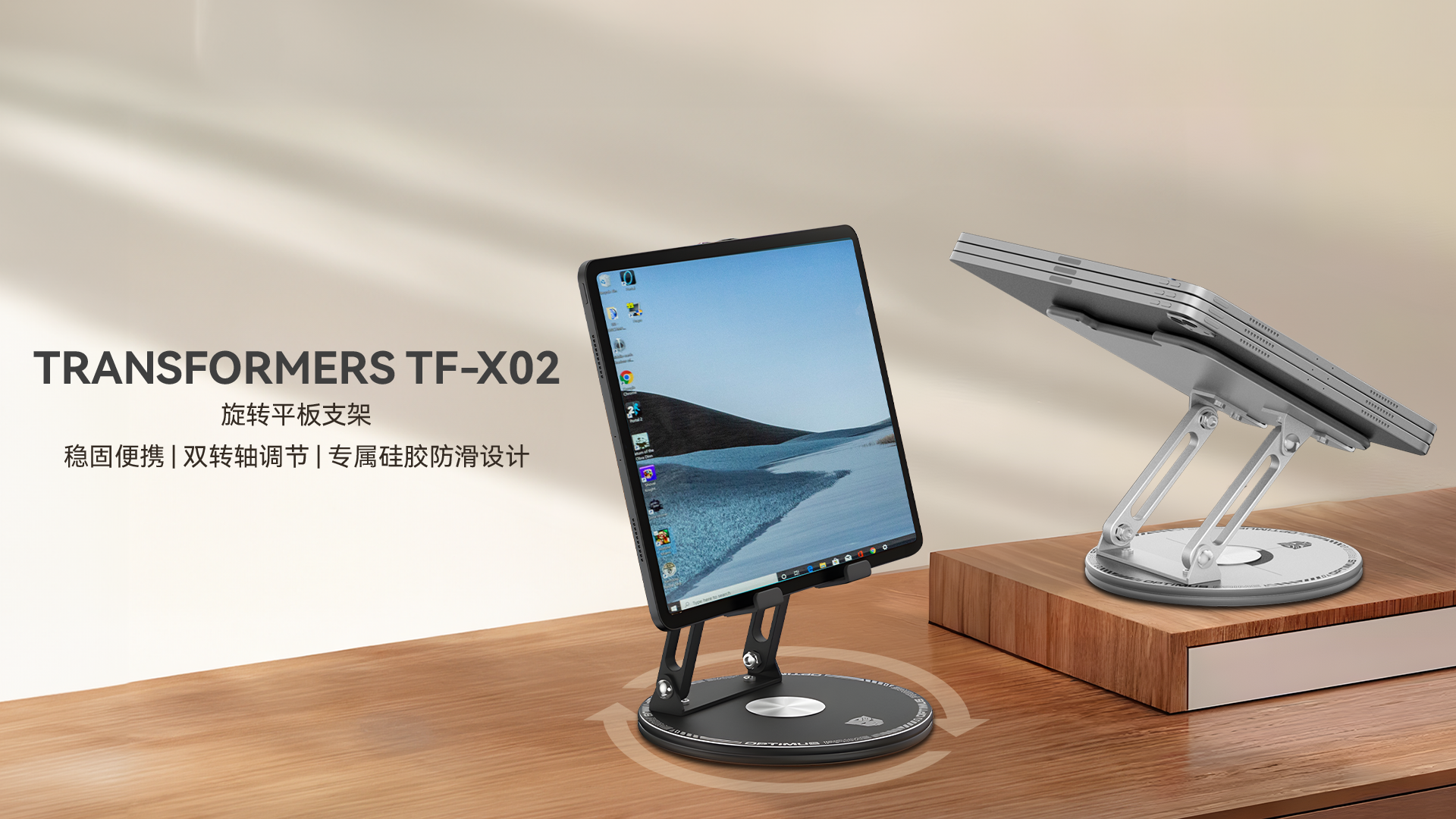 变形金刚TRANSFORMERS TF-X02固定平板支架,工作和娱乐的完美伴侣。采用金属和硅胶材质,质感细腻。合金转轴结构和双轴角度调整,外加紧实牢固的螺旋扣,确保支架的稳定性。不占空间,轻松折叠,方便携带,在差旅出行时也能随心所欲地使用。专属硅胶套加宽并带有防滑功能,保护设备不易滑落,避免刮伤。面板顶部采用镂空设计,适用于顶部中间有摄像头的学习平板,不会阻挡摄像头的使用。