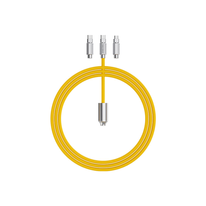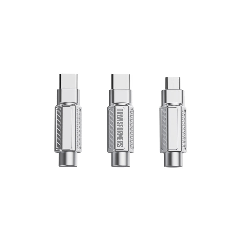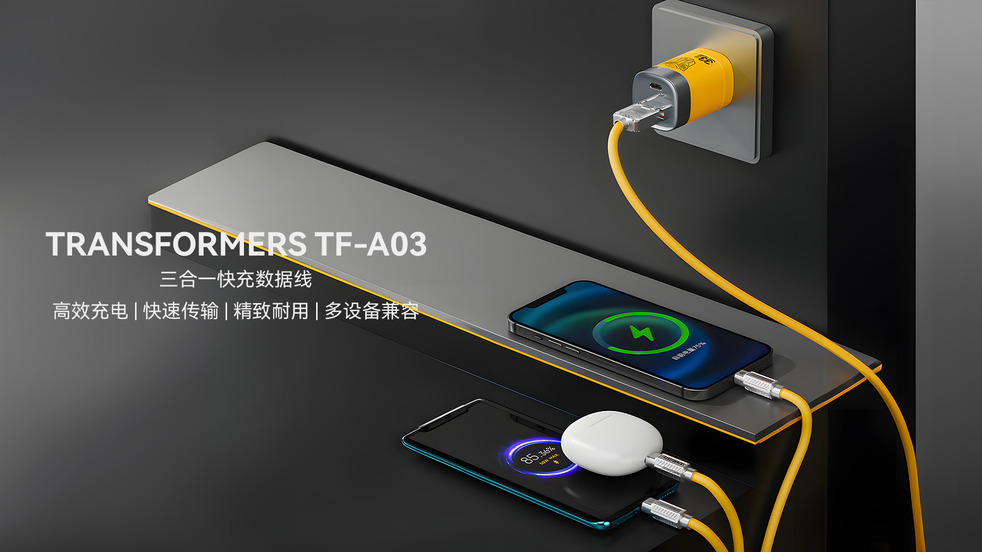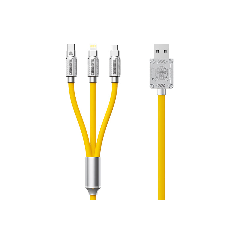 变形金刚TRANSFORMERS TF-A03三合一快充数据线,带来高效的充电和数据传输体验。采用优质TPE材料,保证线材的洁净和无杂质,久用不变黄。耐刮耐磨的锌合金金属亮面外壳,在日常插拔中不留脏污,耐磨防刮花。近90°随意折弯,加固柔软接头,极大解决断裂难题,经受住暴力上万次弯折考验。采用4股126根粗线芯,增强传导能力。1.2米的线长足够满足日常充电需求,让后座充电更加轻松。Lighting、Micro和Type-C接口,兼容多种设备。支持多线同时充电,可智能分流,让设备快速充满电。