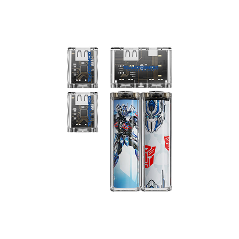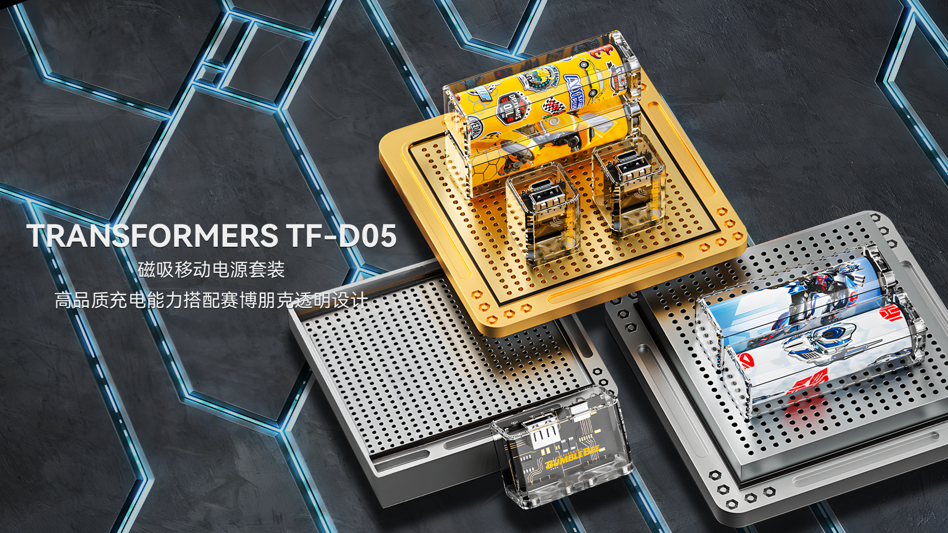 变形金刚TRANSFORMERS TF-D05磁吸移动电源套装,以透明机械设计为特色,引领赛博朋克风潮。清晰地看到内部精密元器件,展现工业美学的魅力。10000mAh随身携带磁吸移动电源,拥有私模外观专利,独具特色。采用大容量电芯和高品质动力电池,支持22.5W超级快充。配备智能控温系统和大容量电池,具备高品质元器件和精密电保护电路,时刻监控工作状态,安全放心。具备双接口输出,支持PO/PPS多协议,可为多台设备提供充电。采用高性能动力和优异安全可靠的电芯,配备高品质5000mAh电池,支持多种快充协议,可供USB-C接口和笔记本快充,提高充电效率,适用安全放心。